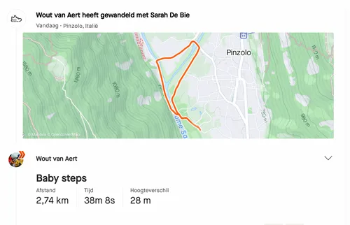 Hij blijkt ook van zijn krukken verlost te zijn, want Van Aert maakte een wandeling van 38 minuten in Pinzolo, in de Italiaanse Dolomietetn. "Baby stapjes", schreef hij op Strava. Via Instagram deelde Van Aert een prachtige foto van het dorpje waar hij verblijft. (Foto's onderaan)
