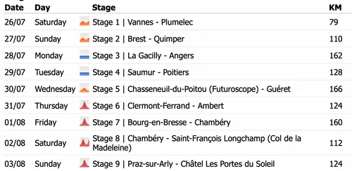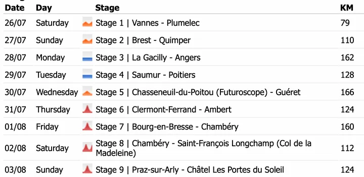 Het Franse Vannes (Bretagne) mag de Grand Départ organiseren. De slotetappe finisht in skioord Châtel, in de Franse Alpen. Er zijn in totaal negen etappes (één meer dan vorig jaar), goed voor een totale afstand van 1165 kilometer en 17.240 hoogtemeters.