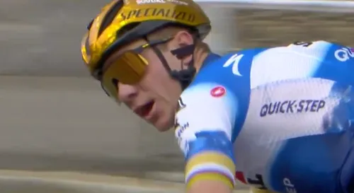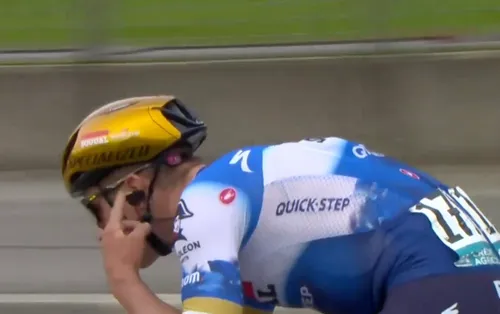 In de finale, toen hij aan het achtervolgen was op Pogacar, kreeg Evenepoel het aan de stok met een tv-motard die naast hem reed. Evenepoel was van alles aan het roepen en maakte heel wat misbaar met zijn armen.