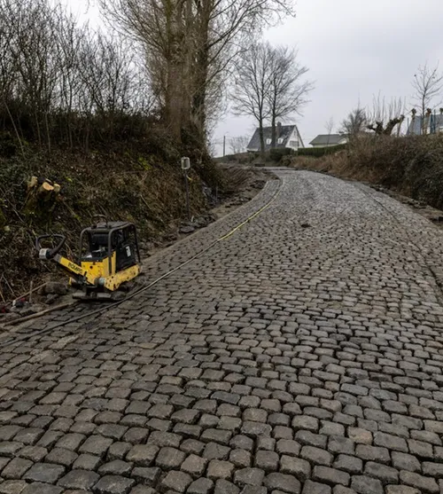 Het gaat om de Eikenberg. De iconische helling in Maarke telt 1200 meter kasseien en heeft een gemiddeld stijgingspercentage van 5%. Op dit moment wordt de straat heraangelegd en ontbreken enkele honderden meters aan kasseien.