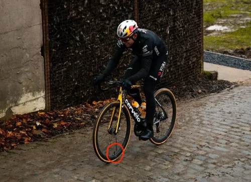 Van Aert en zijn ploeg Visma - Lease a Bike deelden via Instagram enkele beelden van de verkenning op de kasseistroken en daarop is te zien dat de wielen van Van Aert uitgerust zijn met een technologisch snufje.