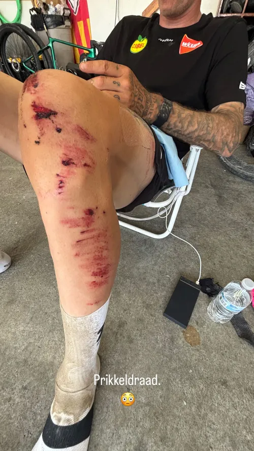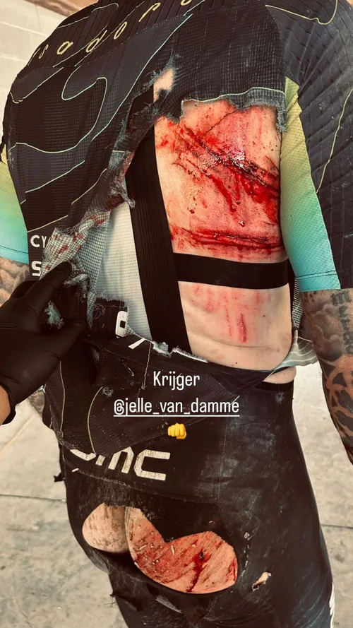Op beelden die Ruben Van Gucht via Instagram deelde is te zien dat Van Damme heel pijnlijke verwondingen heeft opgelopen na een val in prikkeldraad. Die prikkeldraad ging dwars door zijn shirt, want zijn rug is flink gehavend. Ook zijn achterwerk en beide benen bleven niet gespaard. Het is niet duidelijk of hij de finish heeft gehaald. (beelden onderaan)