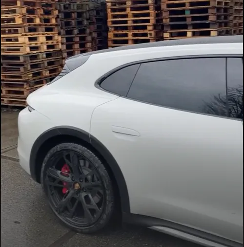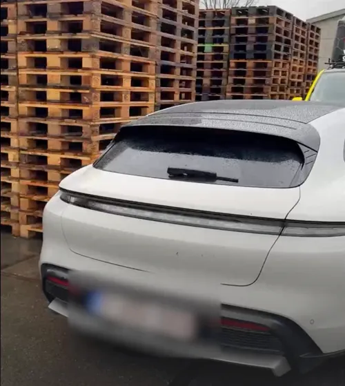 Het bleek de Porsche Taycan van Wout van Aert te zijn. De elektrische gezinswagen heeft een vanafprijs van 87.000 euro. Van Aert wordt niet gesponsord door Porsche en kocht de wagen enkele jaren geleden zelf aan. In Gullegem kwam hij zaterdag opdagen in een Range Rover.