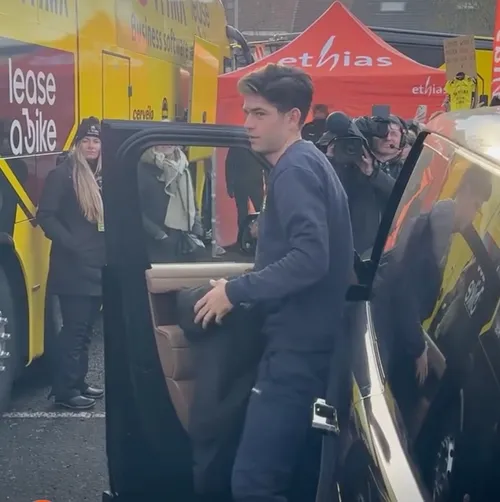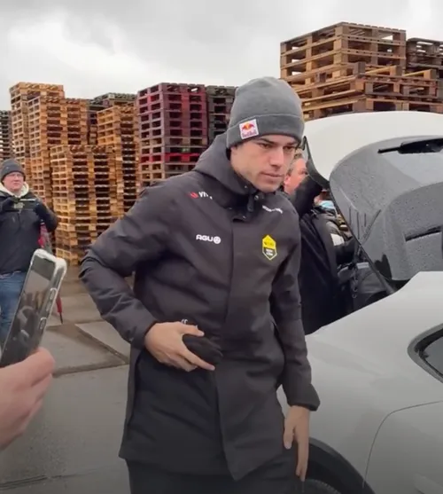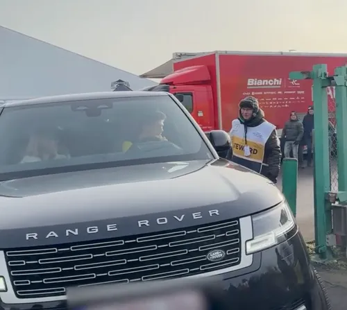 Enkele fans waren er desondanks in geslaagd om hun weg naar dat bedrijventerrein te vinden. Zij stonden vol spanning te wachten aan de bus van Visma - Lease a Bike, in de hoop een foto of handtekening te scoren. Hun grote held was evenwel in geen velden te bespeuren. Tot er plots een lichtgrijze Porsche arriveerde!