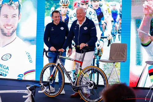 De 70-jarige West-Vlaming kreeg een exclusieve racefiets van Specialized cadeau. De lak verwijst naar enkele bijzondere statistieken die hij als grote baas van de Quick-Step behaalde, zoals het aantal overwinningen en het aantal monumenten dat de ploeg won.