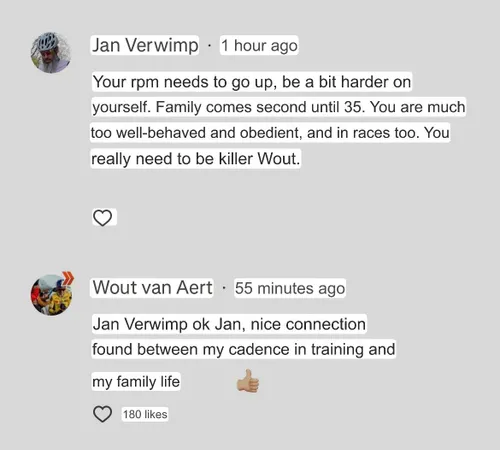 Die reacties waren niet allemaal positief. Een zekere Jan dacht Van Aert even wat advies te kunnen geven en zag een vreemd verband tussen zijn RPM (omwentelingen per minuut) en gezinsleven.