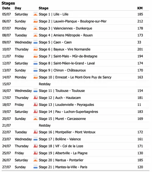 Er zijn vijf bergetappes, vijf vlakke etappes, negen heuveletappes en twee tijdritten. Op dag vijf staat een vlakke tijdrit van 33 kilometer op het programma. Op dag 13 moeten de renners een klimtijdrit van 11 kilometer naar Peyragudes afleggen.