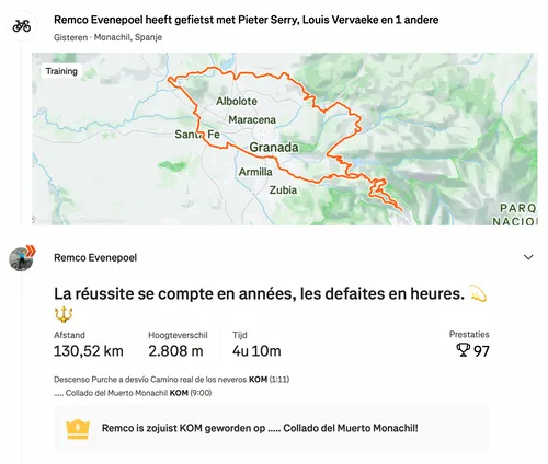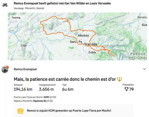 Evenepoel deelde zijn training via Strava en plaatste een opvallende boodschap in de titel. "Mais, la patience est carrée donc le chemin est d’or", klinkt het. Een dag eerder schreef hij 'La réussite se compte en années, les defaites en heures'.