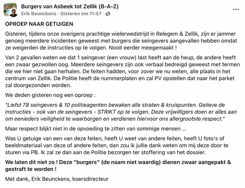 Beunckens wil dit niet zomaar laten passeren. De politie is op de hoogte en heeft een proces-verbaal opgesteld. Via Facebook doet Beunckens een oproep naar getuigen. "Dit heb ik nooit eerder meegemaakt", schrijft hij.