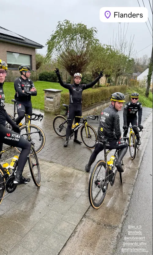 Niet alleen Van Aert, maar ook heel wat van zijn ploegmakkers waren maandag in Vlaanderen. Het gezelschap ging namelijk op verkenning in de Vlaamse Ardennen, in functie van het klassieke voorjaar.
