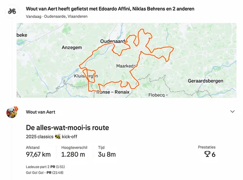 Van Aert & co beklommen onder meer de Oude Kwaremont, Paterberg, Molenberg, Haaghoek, Leberg, Berendries, Valkenberg, Kanarieberg en Trieu. Het flandrien-weer maakte het plaatje helemaal compleet. Ze klokten af op een kleine 100 kilometer.