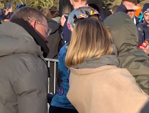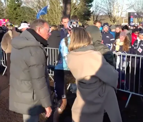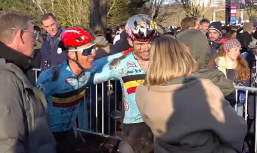 Aan de finish stonden echtgenote Sarah De Bie en zoontjes Georges (4) en Jerome (1) hem op te wachten. UCI-topman Peter Van Den Abeele kwam het familiemomentje een beetje verstoren.