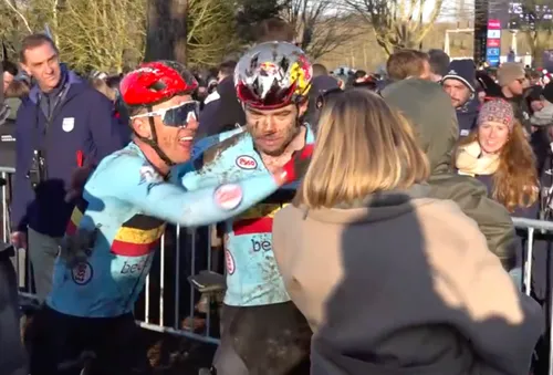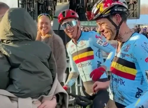 Even later bolde Thibau Nys over de streep en zocht hij Van Aert op om hem te feliciteren. De Europese kampioen zei ook even goeiedag aan de kleine Georges.
