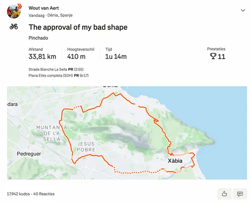 Dat blijkt uit een training die Van Aert deelde via Strava. Hij werkte vandaag aan de Spaanse kust een recuperatietraining van slechts 33 kilometer af, aan lage snelheid. "Bevestiging van mijn slechte vorm", klinkt het. Over een goeie maand is hij van plan om het veld in te duiken