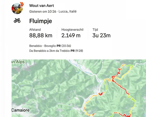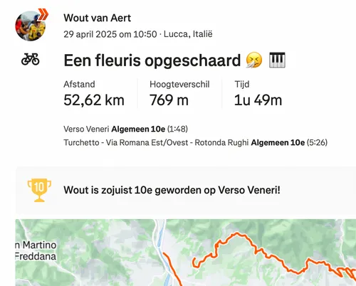 De laatste voorbereiding op die Giro loopt niet helemaal zoals gepland. Via Strava laat Van Aert weten dat hij ziek geworden is. Wellicht gaat het om een verkoudheid, al spreekt hij zelf van een 'fleuris' (pleuritis).