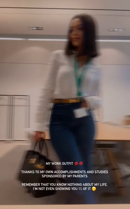 Via Instagram deelde Oumi een foto van haar 'werkoutfit'. "Dankzij mijn eigen verwezenlijkingen en studies, gesponsord door mijn ouders", schreef ze erbij. "Onthoud goed dat je niets weet over mijn leven. Ik laat je niet eens 1% van mijn leven zien."