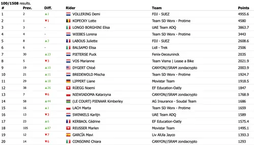 Lotte Kopecky staat op nummer twee met 4580 punten. De kloof met de nummer drie, Elisa Longo Borghini, is groot. De Italiaanse telt op dit moment 3863.7 punten.