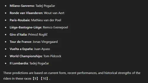 Tadej Pogacar kan maar beter hopen dat ChatGPT de bal misslaat, want de chatbot voorspelt dat de wereldkampioen in 2025 geen enkele grote ronde zal winnen. Wout van Aert zou de Ronde van Vlaanderen moeten winnen en