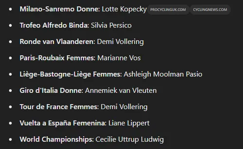 In Lotte Kopecky heeft ChatGPT maar weinig vertrouwen. Ze voorspellen dat de wereldkampioene enkel in Milaan-San Remo haar regenboogshirt zal laten schitteren. Demi Vollering zou de Ronde van Vlaanderen én de Tour de France moeten winnen. Wie er in 2025 wereldkampioene zal worden? Cecilie Uttrup Ludwig!
