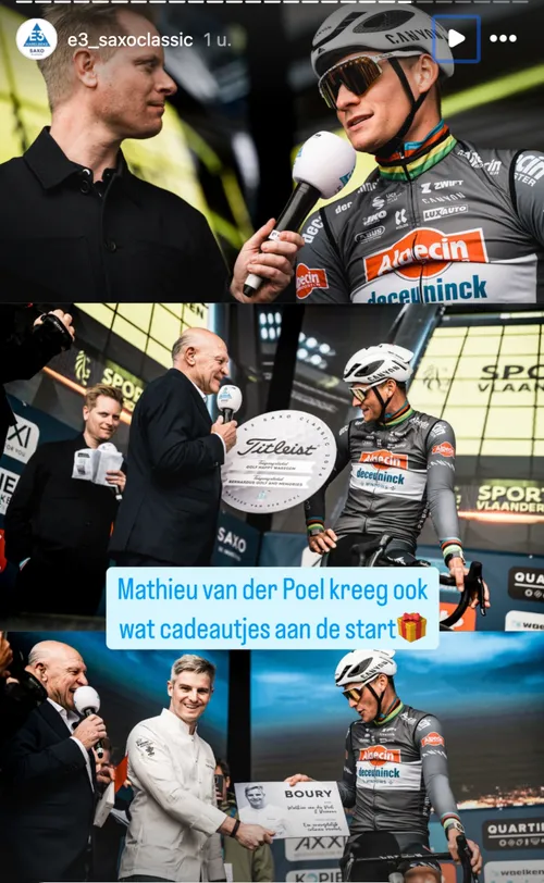 De organisatie van de E3 Saxo Classic bedenkt elk jaar een leuk cadeau voor de winnaar van een jaar eerder. In 2024 won Mathieu van der Poel. Hij mocht zijn cadeau op het podium in ontvangst nemen.