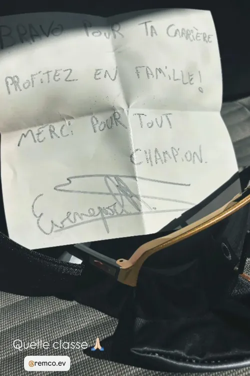 Remco Evenepoel had nog iets extra in petto voor de 34-jarige Fransman. Hij gaf hem zijn gouden fietsbril als afscheidscadeau. Er zat ook een briefje bij waarop stond: 'Proficiat met je carrière. Geniet nu maar met je familie. Bedankt voor alles, kampioen'.