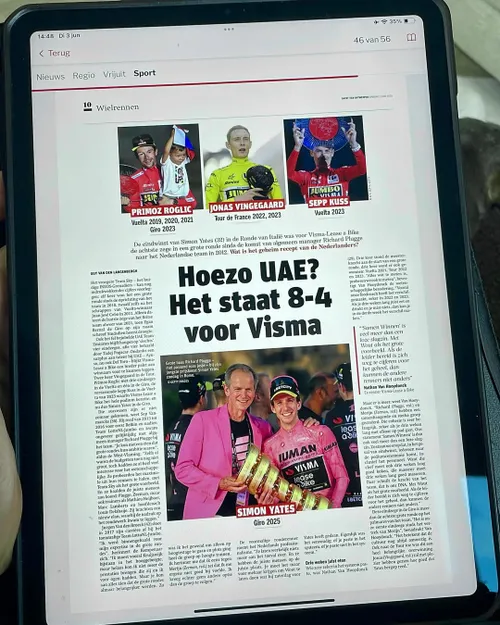 Van Aert heeft nu nog een beetje olie op het vuur gegooid. Hij deelde via Instagram een foto van een krantenartikel. 'Hoezo UAE? Het staat 8-3 voor Visma' valt er in de titel te lezen.