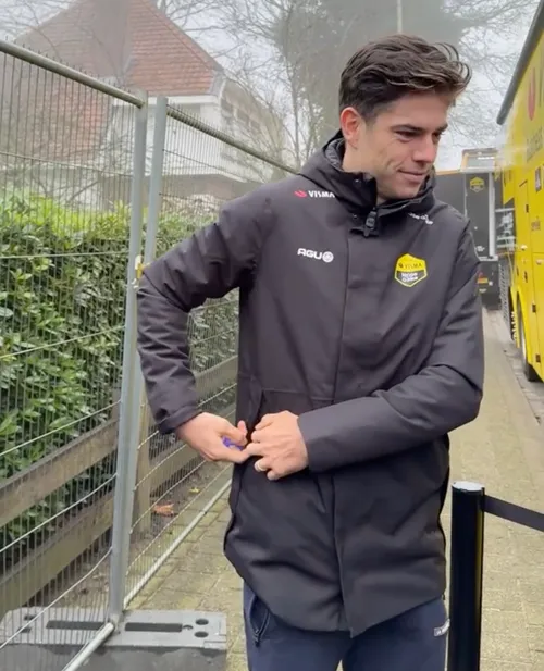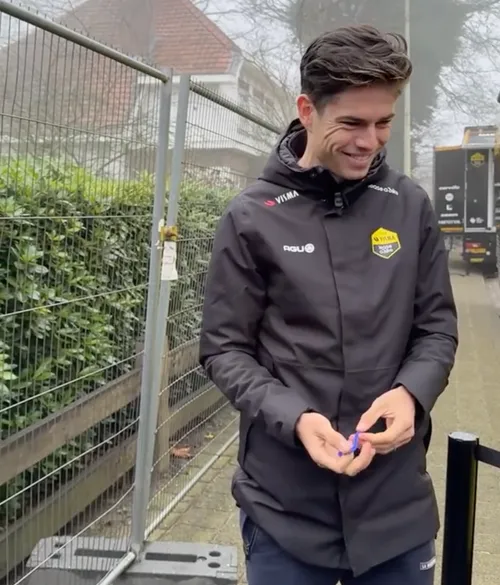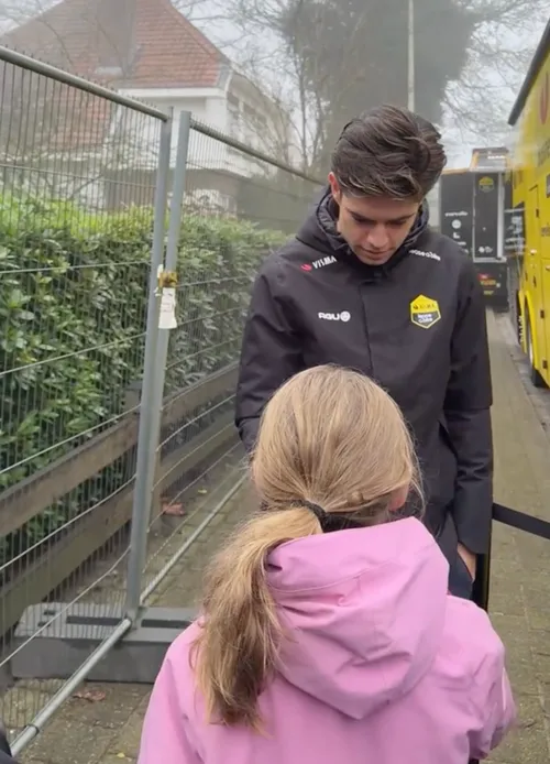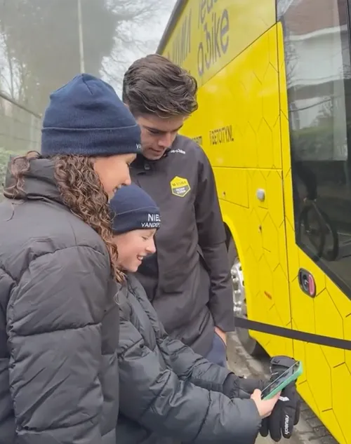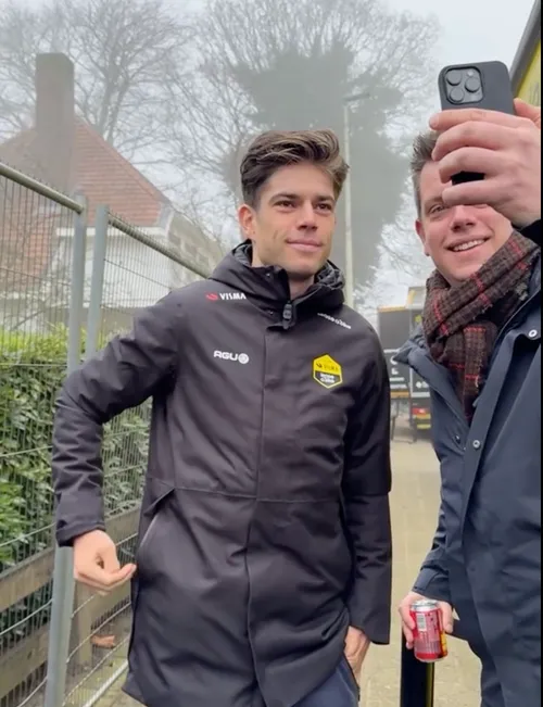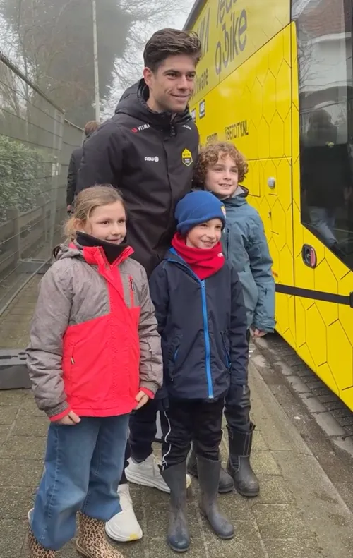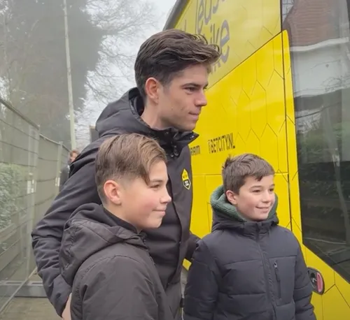Aan de bus van Visma - Lease a Bike stonden heel wat van zijn fans, jong en oud, hem op te wachten, in de hoop een handtekening of foto te scoren. Met succes: Van Aert kwam plots uit de bus gestapt en maakte tijd vrij voor zijn fans.