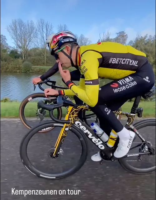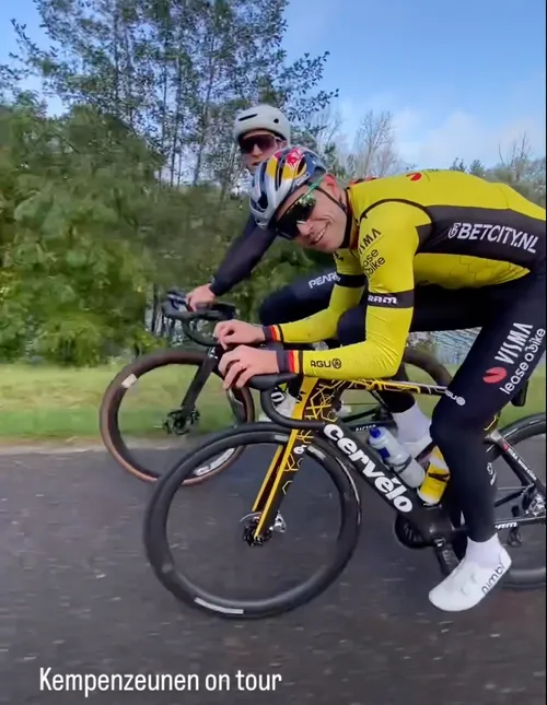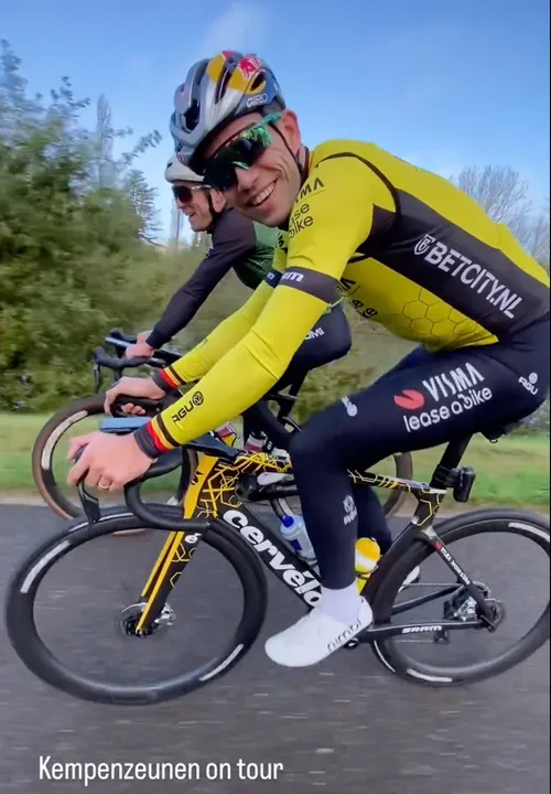 Wout van Aert is met totaal andere dingen bezig. Hij is al hard aan het rijden in functie van de komende crosswinter en volgend wegseizoen. Vandaag ging hij 101 kilometer fietsen met Jan Bakelants en Daan Soete. De beelden: