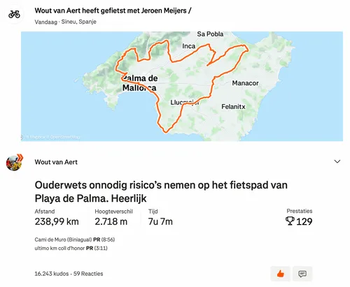 Van Aert doorkruiste bijna het hele eiland en klokte af op 238,99 kilometer, 2718 hoogtemeters en een gemiddelde snelheid van 33.5 km/h! Het is daar gelukkig niet aan het sneeuwen zoals hier in België. De zon scheen een hele dag en de temperatuur bedroeg 9°C.