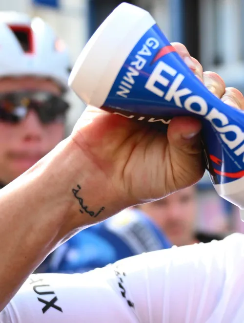 Aandachtige wielerfans merkten tijdens zijn seizoensdebuut in de Brabantse Pijl al op dat Evenepoel een tattoo op de binnekant van zijn pols had. In de Dauphiné werd die tattoo voor het eerst duidelijk in beeld gebracht, toen hij van een bidon dronk.