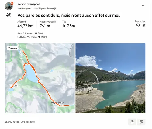De olympische kampioen werkte maandag een herstelritje van anderhalf uur af. "Vos paroles sont durs, mais n’ont aucon effet sur moi", schreef hij op Strava. De Nederlandse vertaling luidt 'Jullie woorden zijn hard, maar ze hebben geen enkel effect op mij.'