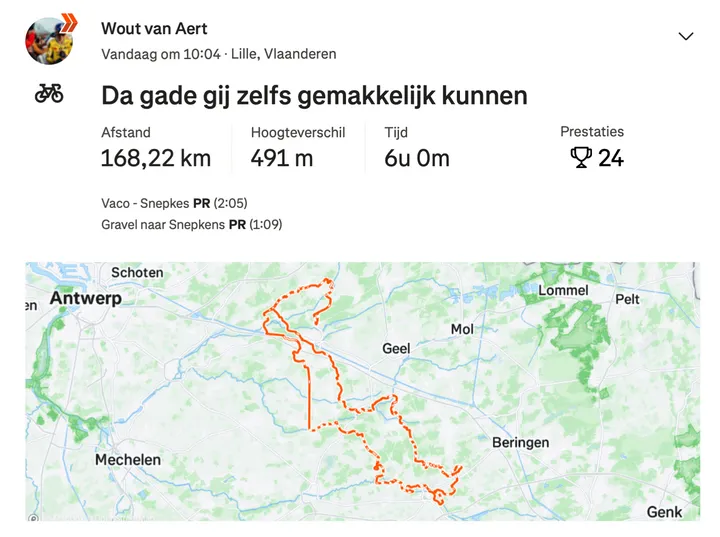 De 30-jarige Belg sprong maandagochtend om 10.04 uur alweer op de fiets. En niet voor een herstelritje. Van Aert ging maar liefst zes uur trainen en klokte af op 168 kilometer aan 28 km/h gemiddeld!