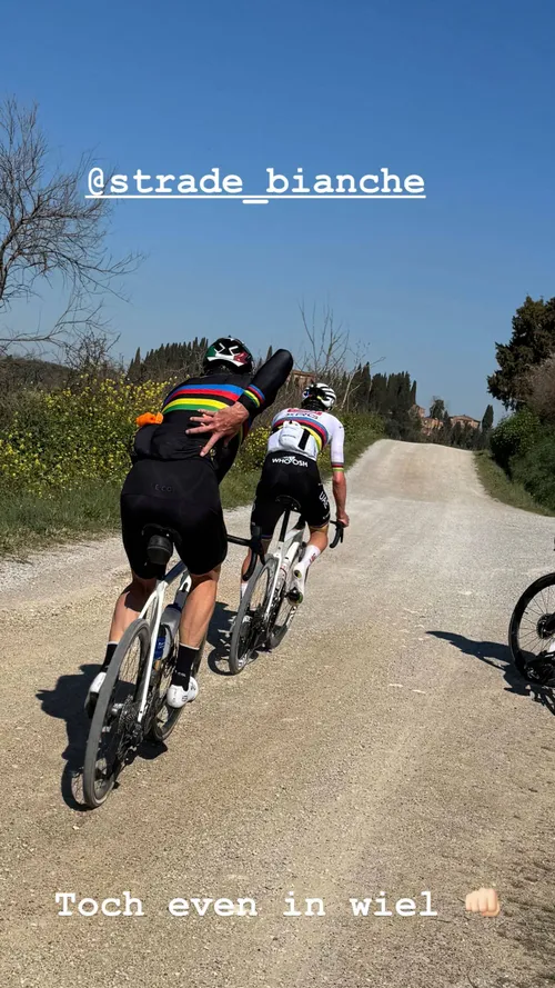 Museeuw en Pogacar liepen elkaar tijdens de verkenning tegen het lijf op een klimmetje. Museeuw deed een poging om in het wiel de 32-jarige jongere wereldkampioen te kruipen en dat lukte hem ook even. (beelden onderaan)