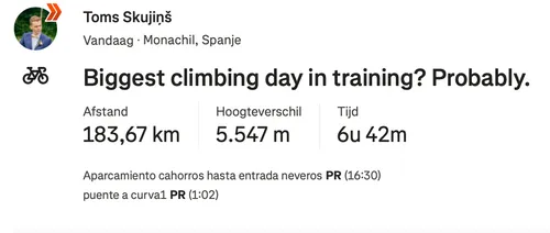 Donderdag werkte Nys samen met enkele ploegmakkers een monstertraining van bijna 7 uur in het Zuid-Spaanse gebergte af. Het gezelschap klokte af op 183 kilometer en 5547 hoogtemeters.