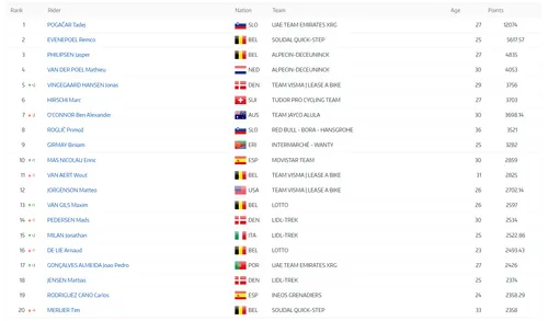 Tadej Pogacar voert de ranking aan. De wereldkampioen telt meer dan dubbel zoveel punten dan de nummer twee,